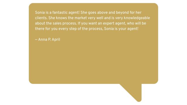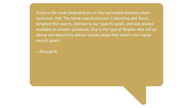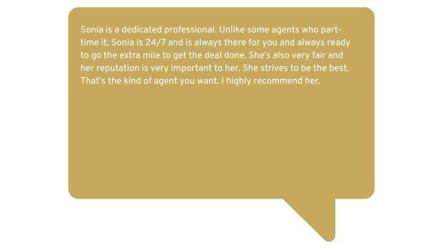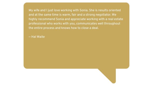 With 18 years experience, Sonia is helpful, hardworking, and customer service oriented, delivering concierge services to her clients. She has helped people navigate all the preparations for sale, including: staging, coordinating vendors for repairs, marketing, and determining the best strategy for you in selling or purchasing your home.
